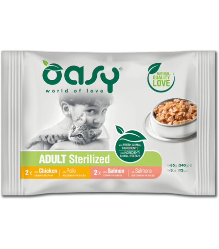 Oasy Cat Bocconcini in Salsa Flowpack Adult Sterilised con Pollo e Salmone 4x85 gr