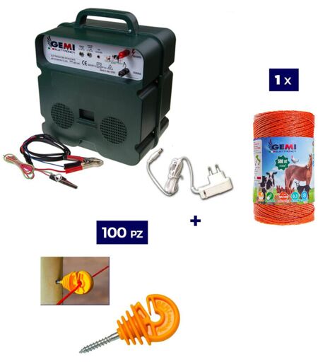 GEMI ELETTRONICA Kit completo per recinto elettrico con 1 x Elettrificatore B12 a doppia alimentazione 12 V / 220 V + 1 x Filo 250 MT 2.2 Mm² + 100 pezzi isolatori