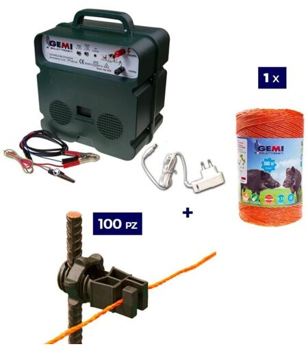 GEMI ELETTRONICA Kit completo per recinto elettrico con 1 x Elettrificatore B12 a doppia alimentazione 12 v / 220 v + 1 x Filo 500 mt 6 Mm² + 100 pezzi isolatori per