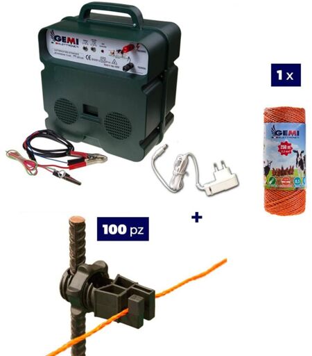 GEMI ELETTRONICA Kit completo per recinto elettrico con 1 x Elettrificatore B12 a doppia alimentazione 12 v / 220 v + 1 x Filo 250 mt 2.2 Mm² + 100 pezzi isolatori