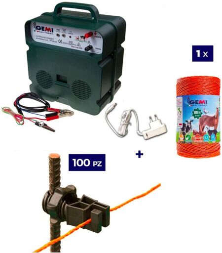 GEMI ELETTRONICA Kit completo per recinto elettrico con 1 x Elettrificatore B12 a doppia alimentazione 12 v / 220 v + 1 x Filo 500 mt 4 Mm² + 100 pezzi isolatori per