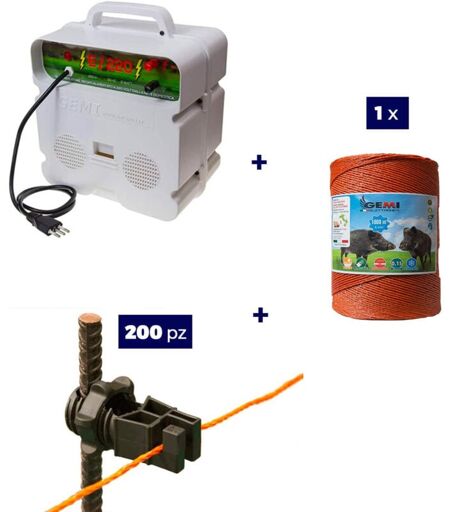 GEMI ELETTRONICA Kit completo per recinto elettrico con 1 x Elettrificatore 220V + 1 x Filo 1000 mt 6 Mm² + 200 pz isolatori per paletti in ferro - Recinzione