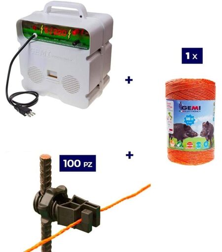 GEMI ELETTRONICA Kit completo per recinto elettrico con 1 x Elettrificatore 220V + 1 x Filo 500 mt 6 Mm² + 100 pz isolatori per paletti in ferro - Recinzione