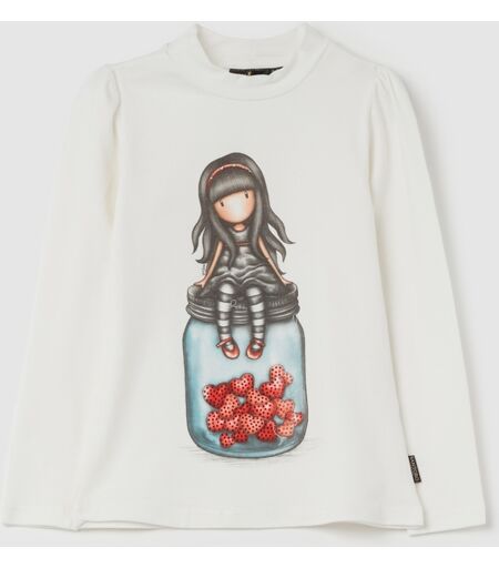 T-shirt in cotone stretch. Mock neck. Maniche lunghe a palloncino. Stampa Santoro Gorjuss e contenitore di cuori con strass sul davanti. ...