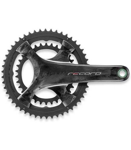 La nuova guarnitura Record ™ 12x2 Speed:un nuovo design privo di fori per la manovella destra che ottimizza l'aerodinamica.La nuova guarnitura Record ™ 12x2 Speed in fibra di carbonio con finitura unidirezionale garantisce continuità con le finiture dell'intero gruppo, mantenendo il sistema di staffe Ultra Torque sull'asse in acciaio per garantire una trasmissione perfetta della potenza.La nuova guarnitura Record ™ 12x2 Speed può essere installata su qualsiasi tipo di telaio, indipendentemente dal fatto che venga utilizzata o meno con i freni a disco perché ottimizza la linea della catena sul telaio con una flangia del mozzo posteriore che misura 130, 135 o 142 millimetri, senza influire il fattore Q che rimane costante a 145,5 millimetri.Il design innovativo della corona esterna assicura un deragliamento più rapido e silenzioso grazie al perno sagomato.Il design simmetrico dei denti della corona interna consente una migliore stabilità con crossover a catena.Gli standard di dimensionamento delle ruote doppie (112 e 145 millimetri) consentono di ridurre il peso attraverso un maggiore utilizzo della fibra di carbonio.Sono disponibili otto viti di fissaggio per una maggiore rigidità della struttura.Il numero variabile di perni per ciascuna delle tre combinazioni di corona (34/50, 36/52, 39/53) facilita il cambio di marcia grazie alle corse libere ottimizzate associate a ciascuna combinazione.Gli speciali drenaggi all'interno delle corone esterne ottimizzano le prestazioni quando si cambia marcia in punti morti. ...