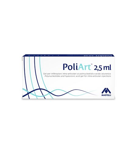 PoliArt 2,5 ml - Gel per infiltrazioni intra - articolari ai polinucleotidi e acido ialuronico - Descrizione Dispositivo medico a base di polinucleotidi alla concentrazione di 10 mg/ml e acido ialuronico sale sodico alla concentrazione di 10 mg/ml. Si presenta come soluzione sterile, apirogena, vis… ...