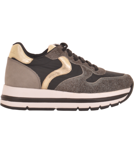 Questa sneaker e il modello Maran in versione nero/oro, caratterizzato da un design dinamico e ricercato. La tomaia combina diversi materiali: tessuto tecnico nero, inserti in lana grigia e dettagli in pelle metallizzata color oro, che aggiungono un tocco di luce e originalita. Il tallone in suede grigio offre ulteriore struttura e raffinatezza. La suola bicolore, alta e ammortizzata, garantisce comfort e uno slancio visivo contemporaneo, perfetto per la vita urbana. Questa scarpa fonde perfettamente eleganza e sportivita, rendendola ideale per chi cerca uno stile distintivo senza rinunciare alla comodita. ...