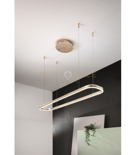 Lampadario Con Montatura In Metallo Verniciato Oro Satinato. Sospensione Di Forma Rettangoare Ad Angoli Arrotondati Con Struttura In Metallo E Diffusori A Led Sul Perimetro Superiore Ed Inferiore. Cavi In Acciaio Regolabili In Lunghezza. ...