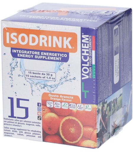 Gli integratori non sostituiscono un’alimentazione equilibrata e variegata e uno stile di vita sano.Isodrink è un integratore alimentare adatto per la preparazione di bevande energetiche reidratanti isotoniche, a base di:-carboidrati energetici naturali: fruttosio; polimeri del glucosio (maltodestrine di mais), ad alto indice glicemico; -sali minerali: magnesio, sodio, potassio, bicarbonato, bilanciati in modo da reintegrare rapidamente ed efficacemente le perdite idrosaline in condizioni di abbondante sudorazione;-vitamina C ad azione antiossidante.L’assunzione di Isodrink® con carboidrati-elettroliti durante esercizi prolungati con intensi sforzi muscolari contrasta i fattori maggiormente coinvolti nell’insorgenza della fatica permettendo di migliorare la prestazione. Gusto AranciaIngredientifruttosio, maltodestrine di mais, correttori di acidità: acido citrico, acido tartarico, sodio bicarbonato; potassio tartrato, vitamina C, magnesio ossido, colorante naturale: betacarotene E160a, succo disidratato di arancia, aroma. Non contiene fonti di glutine, fibre, conservanti, coloranti e dolcificanti artificiali.Valori mediper 100 gper 2 buste(60 g)%VNR* Energia1.576 kJ 371 kcal946 kJ 223 kcal11% Grassi0 g0 g Carboidrati di cui zuccheri di cui polimeri di glucosio88,3 g 72 g 16,3 g53 g 43 g 10 g20% 48% Proteine0 g0 g Sodio0,77 g460 mg (20 mmol) Potassio0,32 g195 mg (5 mmol) Magnesio81 mg49 mg (2 mmol) Bicarbonati2,0 g1.225 mg (20 mmol) Vitamina C200 mg120 mg150% *Valori nutritivi di riferimentoAssunzione consigliata1-4 bustine da 30g al giorno. Sciogliere una bustina in mezzo litro d'acqua.Avvertenze:Non superare la dose giornaliera raccomandata. Tenere fuori dalla portata dei bambini al di sotto dei tre anni. Conservazione:Conservare in un luogo fresco e asciutto. Si prega di fare riferimento, se necessario, ad ulteriori istruzioni riportate sulla confezione.Contenuto netto450 gProduttoreVolchem SrlVia E. Dandolo, 5235010, Grossa Di Gazzo, PdItalia ...