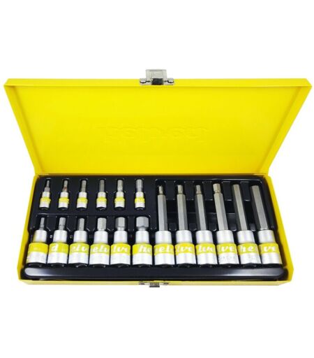 SET CHIAVI A BUSSOLA ESAGONALI MASCHIO DA 18 PEZZI La confezione in metallo contiene 18 chiavi a bussola realizzate in acciaio CROMO VANADIUM: - 6 Pezzi con attacco 1/4 corte di misura: HW 3,4,5,6,7,8 ( x 37mm) - 6 Pezzi con attacco 1/2 di misura: HW 6,7,8,10,12,14 ( x 55mm) - 6 Pezzi con attacco 1/2 di misura: HW 5, 6,7,8,10,12 ( x 100mm) ...