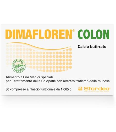 DIMAFLOREN COLON - Descrizione Alimento a fini medici speciali con calcio butirrato zinco e acido folico è da utilizzare sotto controllo medico ed è stato progettato per il trattamento dietetico delle colopatie con alterato trofismo della mucosa. - Ingredienti Calcio butirrato; agenti di carica: … ...