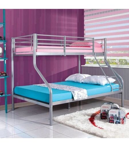 Letto a castello in metallo Aladdin Aladdin è composto da un letto matrimoniale nella parte inferiore e un singolo in quella superiore. Soluzione ideale per stanze con poco spazio. La struttura è in metallo colore alluminio e comprende 13 robuste doghe in tubolare d'acciaio . Importante è la sicurezza dei vostri bambini, infatti la parte superiore offre protezione su tutti e quattro i lati. Caratteristiche: Materiale acciaio. Misure letto inferiore 140x190 cm. Misure letto superiore 90x190 cm. Altezza struttura 160 cm. Misure: 189.5 x 142.6 x 160H 13 doghe per letto smontabili Barriere di protezione smontabili Materassi non inclusi. Il prodotto viene spedito smontato Perchè scegliere il letto a castello Aladdin? E' semplicemente innovativo: letto matrimoniale e letto singolo in un'unica soluzione! Perfetto per chi ha poco spazio a disposizione. E' solido e resistente. Ha un design super moderno. ...