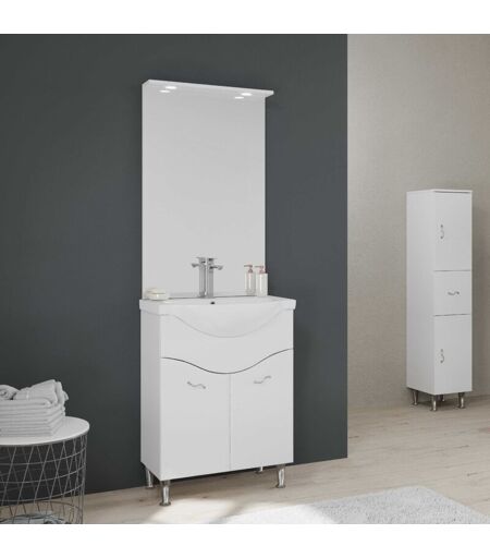 MOBILE BAGNO A TERRA 65 CM CON ANTE, LAVABO E SPECCHIO CON FARETTI LED BIANCO LUCIDO La collezione Easy, si amplia con una nuova proposta, il mobile bagno da 65 cm a terra con due ante, lavabo e specchio. La base presenta i laterali in legno nobilitato laccato UV rifinito in bianco lucido , mentre i frontali sono in mdf rivestiti in pressa con PVC bianco lucido con pellicola di protezione. Le ante sono dotate di due maniglie in metallo cromato. I piedini sono regolabili ed in abs cromato. Il lavabo, dotato di una vaschetta estremamente capiente, è in ceramica di prima qualità. La composizione si completa con una specchiera fornita di illuminazione. Larghezza 65cm Illuminazione: 2 faretti led IP44 2X2W 6500 K SENZA Colonna, sifone e rubinetteria KVstore, esperto di arredo bagno, seleziona con cura le proposte da inserire in Catalogo. Ogni prodotto è progettato per soddisfare le esigenze di funzionalità e comodità tipiche della stanza da bagno. Nella selezione dedicata ai mobili bagno a ...