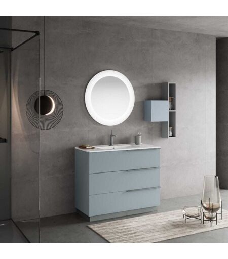 MOBILE BAGNO A TERRA CON LAVABO 100CM, 2 CASSETTI CELESTE E SPECCHIO ROTONDO Il mobile bagno a terra 100cm color celeste opaco con lavabo in ceramica e cassetti sottolavabo, è una delle nuove composizioni della linea New York. Questa proposta si compone di una base a terra con 3 cassetti e lavabo ed uno specchio rotondo. La base è composta interamente in mdf certificato fsc , rivestito con pvc per una maggiore resistenza all'umidità, nella delicata finitura celeste opaco. I cassetti sono ad estrazione totale ed hanno la chiusura rallentata per evitare impatti rumorosi. Il primo cassetto dispone di vano per il sifone, tutti dispongono di alte sponde metalliche per trattenere al meglio ogni oggetto. L'apertura è agevolata da una maniglia di design in metallo color antracite. Il lavabo è in ceramica di prima qualità con il foro per il rubinetto ed il troppopieno. Lo specchio rotondo ha una sabbiatura perimetrale retroilluminata a led. Larghezza 100cm, altezza 85cm, profondità 48cm ...