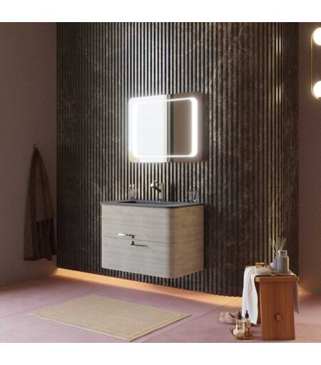 MOBILE BAGNO SOSPESO 80 CM CON 2 CASSETTI ROVERE ARTICO E LAVABO IN RESINA NERO OPACO Il mobile bagno sospeso Hollywood si caratterizza per il contrasto tra elementi moderni, come il lavabo in resina nero opaco e gli angoli smussati che ne alleggeriscono la forma. La finitura rovere artico effetto legno, addolcisce e allo stesso tempo conferisce personalità alla composizione. Il mobile da 80cm appare compatto, ma il capiente lavabo e gli spaziosi cassetti lo rendono perfetto per coloro che devono riporre detergenti, salviette ed oggetti personali. Il frontale del mobile è arricchito con maniglie di design che agevolano l'apertura dei cassetti, mentre il sistema di chiusura è rallentato. La composizione si completa con una specchiera 80x60 che illumina la zona lavabo e ne esalta i dettagli. Mobile bagno 80cm rovere artico Lavabo in resina nero opaco Specchio a led 80x60 L'offerta non comprende: sifone e rubinetteria per il lavabo, kit per il fissaggio alla parete. I mobili bagno ...