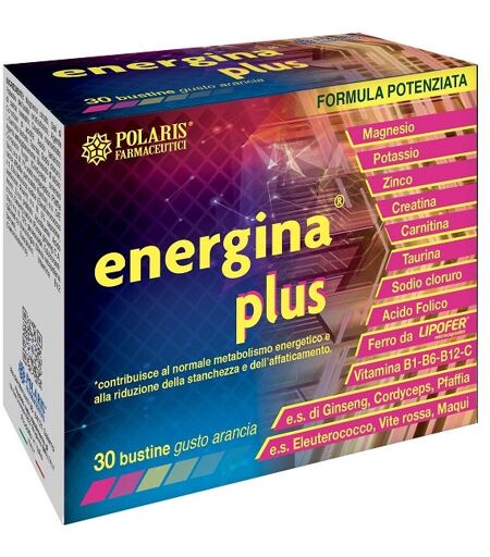 energina plus Descrizione Integratore alimentare a base di magnesio e potassio, con zinco, creatina, carnitina e taurina, vitamine B12, C, B6, B1, acido folico, ed estratti vegetali, indicato in caso di scarso apporto con la dieta o aumentato fabbisogno di tali nutrienti. Il magnesio contribuisce all’equilibrio elettrolitico e, con il potassio, contribuisce alla normale funzione muscolare. Ginseng e Pfaffia svolgono un’azione antiossidante e, con l’eleuterococco, tonico-adattogena. Il Cordyceps è in grado di svolgere un’azione tonica e di sostegno metabolico. Lo Zinco contribuisce alla protezione delle cellule dallo stress ossidativo e al normale metabolismo acido-base. Vitamina B12, B6, C, acido folico, ferro e magnesio contribuiscono al normale metabolismo energetico e alla riduzione della stanchezza e dell’affaticamento. Ingredienti Agente di carica: isomalto; sali di potassio dell’acido ortofosforico, magnesio citrato, creatina monoidrato, L-carnitina tartrato, magnesio ...
