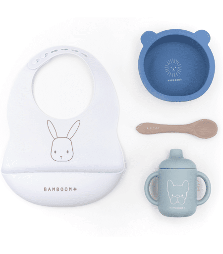 Bamboom Set Baby in Silicone Bavaglino, Scodella, Cucchiaio e Bicchiere con beccuccio Blu