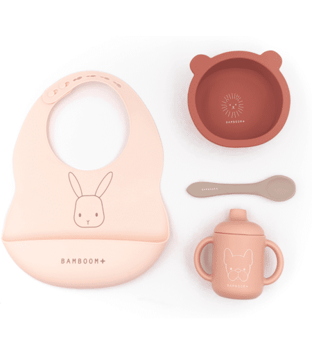 Bamboom Set Baby in Silicone Bavaglino, Scodella, Cucchiaio e Bicchiere con beccuccio Pink