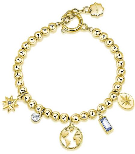 Bracciale Da Donna Di Brosway Della Collezione Chakra. Bracciale Realizzato In Acciaio Con Finitura Color Oro Con Pendenti A Forma Di Mondo, Stelle, Cristalli E Zaffiro. La Chiusura È Con Moschettone. Lunghezza: 185mm. La Referenza È Bhkb119, Materiale ...