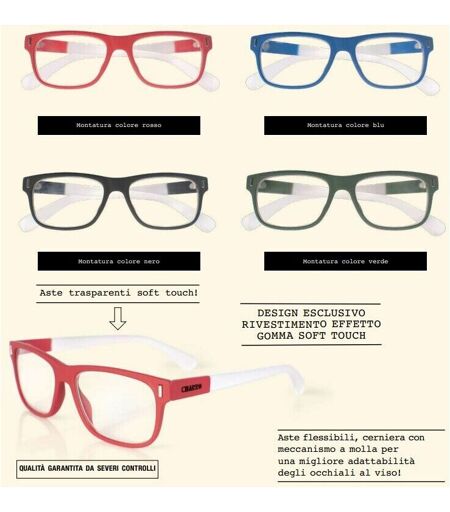 EL CHARRO mod. ALABAMA Occhiali da lettura unisex con doppia colorazione: frontale colorato e aste bianche. Le montature presentano una particolare verniciatura effetto gomma soft touch, per la massima morbidezza al tatto! > Occhiali per presbiopia con montatura in leggerissimo materiale organico iniettato > Montatura con effetto gomma soft touch > Aste flessibili, cerniere con meccanismo a molla per la migliore adattabilità al viso > Lenti asferiche, sottili ed infrangibili, con trattamento antigraffio e antiriflesso > Elegante confezione regalo > Qualità certificata da Certottica, l’Istituto Italiano per la Certificazione dei Prodotti Ottici Misure: - Calibro: 53 mm - Ponte: 15 mm - Lunghezza Aste: 145 mm ...