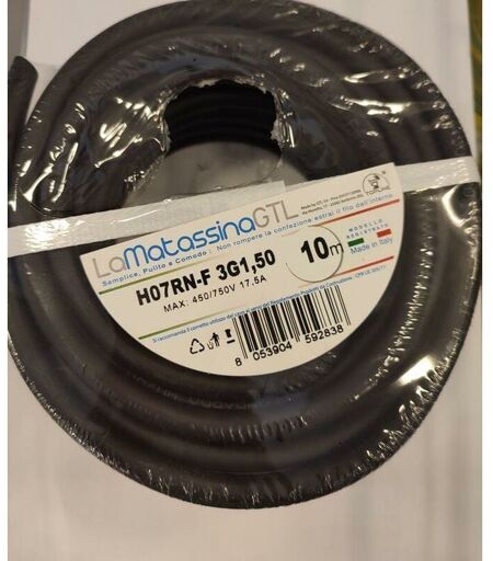 Cavo multipolare H07RN-F 3x1,5 Go-At Toplone MH07RNF3G1,5NE10- 10 metri nero Cavo flessibile sotto guaina pesante di policloroprene o elastomero equivalente.-Forma: Tonda-Posa: Mobile-Conduttore: Conduttore a corda flessibile di rame ricotto stagnato o non stagnato, di classe 5 secondo Norma CEI EN 60228 vigente.-Isolante: Mescola isolante a base di gomma etilenpropilenica di tipo EI4. Isolante elettrico di cavi per posa fissa e collegamenti mobili in ambienti anche bagnati-Guaina: Mescola elastomerica reticolata a base di policloroprene o altro elastomero sintetico equivalente di tipo EM2. Guaina protettiva di cavi elettrici per posa fissa o per collegamenti mobili, per servizio meccanico anche gravoso-Tensione d'esercizio: 450/750 V. -Sezione (n°cond. X mm2) 3Gx1,50-Colore nero ISTRUZIONI PER L'USO:Per uso in officine industriali e agricole, cantieri di costruzione. Per applicazioni per servizio pesante e per l’alimentazione di macchine industriali o agricole ed apparecchi nei quali ...