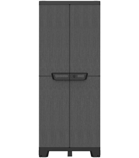 Serie Ardesia. Armadio a 2 ante multifunzionale, dotato di 3 ripiani modulari con inserto estraibile per configurare un armadio portascope. Adatto per interni ed esterni, resistente UV, dotato di maniglia con chiusura antivento e piedini regolabili. Portata ripiano 20 kg uniformemente distribuiti. Possibilit di chiusura con lucchetto (non incluso). Prodotto con 90 di plastica riciclata. Dimensioni cm 68x39x172 Colore grigio/nero. ...