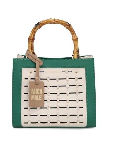 Mini borsa Giada taglio laser colore verde.CARATTERISTICHE PRODOTTOClaim "MICA MALE!"Tracollina removibile in PU e manico a mano in simil BambooChiusura magnete interno centraleShopper in PU laserata con inserti nodini sul fronteSfoderataMetallerie con galvaniche abbinateMisura MiniDIMENSIONIAltezza: 18 cmLarghezza: 21 cmProfondita: 11.5 cm ...
