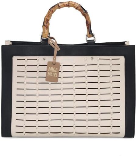 Borsa Giada taglio laser colore nero.CARATTERISTICHE PRODOTTOClaim "MICA MALE!"Tracollina removibile in PU e manico a mano in simil BambooChiusura magnete interno centraleShopper in PU laserata con inserti nodini sul fronteSfoderata con pochette interna con zipMetallerie con galvaniche abbinateMisura GrandeDIMENSIONIAltezza: 30 cmLarghezza: 42 cmProfondita: 14 cm ...