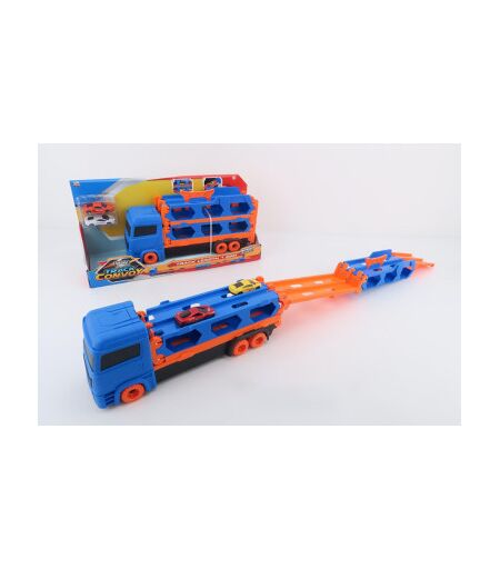 Include 2 veicoli che possono essere riposti nel camion a 2 livelli. Metti in mostra una fantastica collezione facilmente accessibile quando e' il momento di sfrecciare in pista. Solleva la maniglia: il camion si trasforma in un'incredibile pista lunga! Le auto inutilizzate rimangono visibili: che stile che ha la pista! ...
