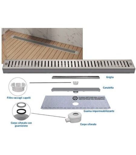 CARATTERISTICHE Per realizzare bagni con scarico a filo pavimento. kit contenente: Corpo sifonato filtro e canaletta in ABS Foglio di guaina impermeabilizzante 100x33 cm. Griglia in acciaio INOX AISI 304 ...