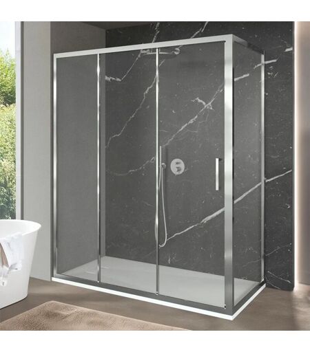 Cabina doccia angolare con vetro 6 mm,porta scorrevole a 3 ante con chiusura magnetica e sgancio rapido La linea Ted propone una vasta gamma di box doccia e porte a nicchia in cui l’eleganza del cristallo temperato con differenti finiture di vetro si unisce ai profili cromati ,per una cabina doccia pratica e versatile da installare sia filo pavimento che su piatto doccia. Il box doccia Ted dispone di lato fisso e porta scorrevole con chiusura magnetica e sgancio rapido;offre installazione reversibile e tolleranza di regolazione pari a 2 cm ,ideale per ottimizzare eventuali pareti fuori squadro. L’apertura scorrevole della porta è accompagnata da pratica maniglia dentro-fuori in acciaio cromato. Box doccia 70x170 cm scorrevole caratteristiche tecniche: Tipologia:box doccia angolare; Linea:Ted; Materiale:cristallo temperato; Profili in alluminio cromato e vetro trasparente 6 mm; Dimensioni:L 170 x p 70 x H 200 cm; Tolleranza di regolazione 2 cm; Porta scorrevole a 3 ante con maniglia in ...