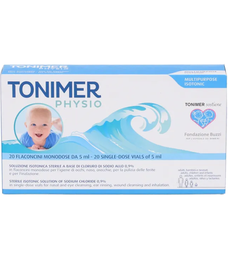 Igiene nasale, oculare, auricolare, ferite, inalazioni - DESCRIZIONE PRODOTTO: - Tonimer Physio Soluzione Isotonica è una soluzione sterile isotonica a base di cloruro di sodio allo 0,9%, confezionata in pratici flaconcini monodose da 5 ml. È indicata per l’igiene quotidiana del naso, degli occhi, … ...