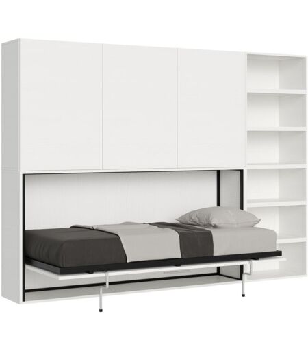 Kando G è un letto singolo a scomparsa che si trasforma in una libreria/armadio con nove vani (tre con anta e ripiano interno e sei aperti). Si tratta di una soluzione originale e funzionale, che permette di ottimizzare lo spazio disponibile, occupando solo 39,2 cm di profondità quando è chiuso. Kando G offre il comfort e il relax di un letto da una piazza e la capienza e l'estetica di un mobile da libreria. Il suo design versatile e moderno si adatta a qualsiasi stile di arredamento. È ideale per chi vive in un monolocale o in un ambiente con spazi limitati e vuole avere più superficie libera durante il giorno. Struttura realizzata con pannelli di particelle di legno nobilitato sp.18 mm. Struttura della rete in ferro rinforzato verniciato a polvere epossidica colore alluminio goffrato. Il meccanismo di apertura è provvisto di un sistema anti-chiusura con bloccaggio di sicurezza con maniglie di sgancio laterali. Incluso di rete ortopedica realizzata in doghe di legno lamellare da ...
