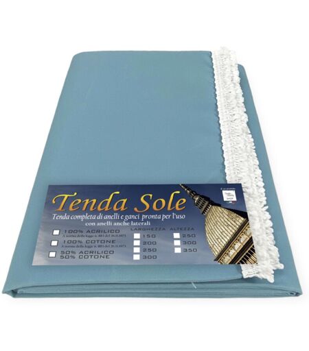 Tenda sole 'azzurro unito' confezionata già pronta per l'uso realizzata in tessuto indistruttibile di acrilico. Rifinita nella parte superiore con puntina e occhielli in acciaio mentre nei lati orlo semplice e nella parte inferiore frangia abbinata. È dotata di ganci in plastica che agganciati agli occhielli in acciaio della tenda gli permettono di essere montata su qualsiasi tipo di bastone. Gli anelli in plastica hanno un diametro di 16 mm. mentre quelli in acciaio dove si agganceranno quelli in plastica hanno un diametro di 9 mm. Dotata anche di OCCHIELLI LATERALI per poter comodamente legarla ai lati. La tenda non è stampata, come nel caso delle tende da sole economiche, ma il tessuto è costruito a telaio in tinto filo. È in tessuto acrilico che resiste ad alte temperature ed ha una durata di parecchi anni. -tessuto..........................................................acrilico -funzione tessuto.............................................coprente -composizione ...