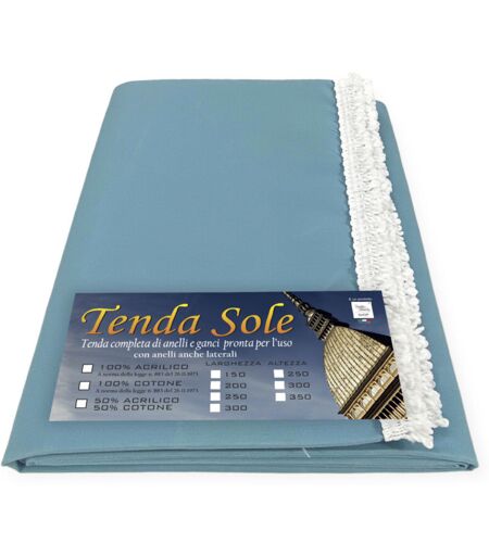 Tenda sole 'azzurro unito' confezionata già pronta per l'uso realizzata in tessuto indistruttibile di acrilico. Rifinita nella parte superiore con puntina e occhielli in acciaio mentre nei lati orlo semplice e nella parte inferiore frangia abbinata. È dotata di ganci in plastica che agganciati agli occhielli in acciaio della tenda gli permettono di essere montata su qualsiasi tipo di bastone. Gli anelli in plastica hanno un diametro di 16 mm. mentre quelli in acciaio dove si agganceranno quelli in plastica hanno un diametro di 9 mm. Dotata anche di OCCHIELLI LATERALI per poter comodamente legarla ai lati. La tenda non è stampata, come nel caso delle tende da sole economiche, ma il tessuto è costruito a telaio in tinto filo. È in tessuto acrilico che resiste ad alte temperature ed ha una durata di parecchi anni. -tessuto..........................................................acrilico -funzione tessuto.............................................coprente -composizione ...