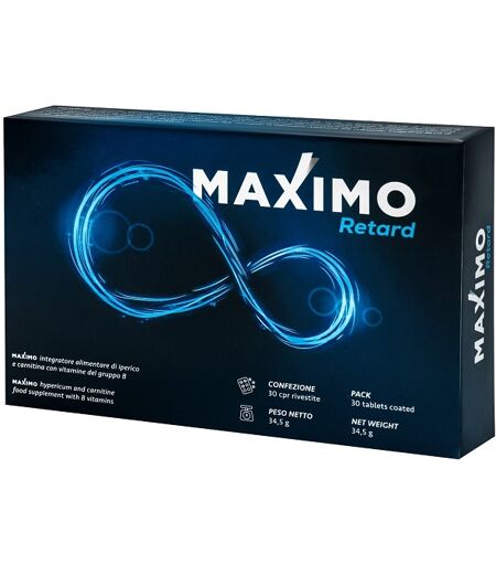 MAXIMO Retard - Descrizione Integratore alimentare a base di L - carnitina iperico vitamina B3 acido pantotenico vitamina B12 e vitamina B6. L'iperico favorisce il normale tono dell'umore contribuisce inoltre al rilassamento e al benessere mentale. La vitamina B3 la vitamina B6 e la vitamin… ...