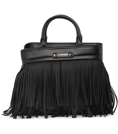 borsa realizzata in similpelle con frange manici e rifiniture in ecopelle. fodera in tessuto con taschino interno chiuso con zip. tracolla regolabile. misure 30 x 30 x 9 cm. colore: nero. ...
