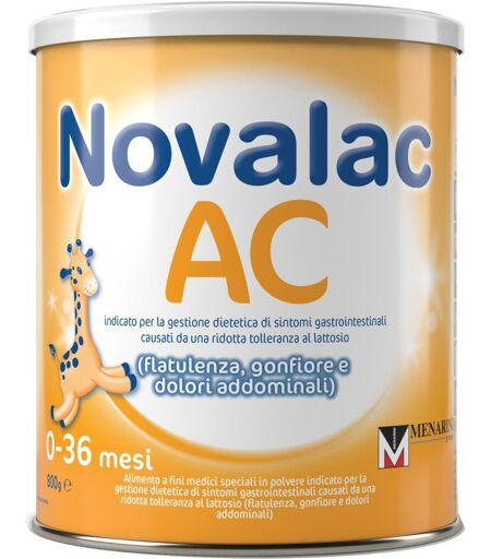 Novalac AC Descrizione Alimento a fini medici speciali in polvere, che grazie al suo contenuto in ferro ed alle sue proteine, è indicato per la gestione di sintomi gastrointestinali causati da una ridotta tolleranza al lattosio (flatulenza, gonfiore e dolori addominali). Può costituire l'unica fonte di nutrimento nei lattanti da 0 a 6 mesi, se non è possibile l'allattamento al seno. successivamente e su consiglio del medico, si integrerà nell'alimentazione diversificata del bambino. Contiene un ridotto contenuto di lattosio per limitarne la fermentazione nel colon. Non deve essere utilizzato nei casi di galattosemia. In caso di allergie, nascita prematura, basso peso alla nascita o immunodeficienza, chiedere il consiglio del medico. Ingredienti Latte scremato, maltodestrine, oli vegetali (palma, soia, cocco), galattoligosaccaridi (Gos) (latte), lattosio (latte), olio di pesce (DHA)(supporto latte), sali di calcio dell'acido citrico), bitartrato di colina, emulsionante (lecitina di soia), cloruro di sodio; vitamine: vitamina C (L-ascorbato di sodio), vitamina E (acetato di DL-alfa tocoferile), acido pantotenico (D-pantotenato, calcio), niacina (nicotinamide), vitamina C (acido L-ascorbico), tiamina (cloridrarto di tiamina), riboflavina, vitamina A (acetato di retinile), vitamina B6 (cloridrato di piridossina), folato (acido folico), vitamina K (fitomenadione), vitamina D (colecalciferolo), D-biotina, vitamina B12 (cianocobalamina); inositolo, pirofosfato ferrico, L-cistina, L-triptofano, cloruro di calcio, cloruro di potassio, bifidobacterium lactis, lactobacillus rhamnosus, olio estratto da Mortierella alpina (ARA)(supporto latte), sali di calcio dell'acido ortofosforico, L-carnitina, ossido di magnesio, solfato rameico, ioduro di potassio, solfato di manganese, citrato di potassio, citrato di sodio. Caratteristiche nutrizionali Valori medi per 100 ml Energia 273 kJ/65 kcal Grassi di cuisaturiacido linoleicoacido alfa-linoleicoDHA (acido docosaesaenoico)ARA (acido arachidonico) 3,3 g1,5 g0,6 g53 mg16 mg4 mg Carboidratidi cui zuccheri di cuilattosioGOS (galattoligosaccaridi) 7,6 g2,4 g2,3 g0,2 g Fibre 0,2 g Proteine 1,4 g Sale 0,06 g Vitamina A 57 mcg Vitamina D 1,5 mcg Vitamina E 1,1 mg Vitamina K 7,8 mcg Vitamina C 7,8 mg Tiamina 104 mcg Riboflavina 156 mcg Niacina 0,6 mg Vitamina B6 65 mcg Acido folico 11 mcg Folato 20 mcg-DFE Vitamina B12 0,2 mcg Biotina 2,3 mcg Acido pantotenico 0,7 mg Sodio 25 mg Potassio 77 mg Cloruro 52 mg Calcio 65 mg Fosforo 44 mg Magnesio 5,2 mg Ferr 0,7 mg Zinco 0,5 mg Rame 50 mcg Manganese 5 mcg Fluoruro ...