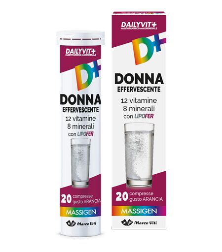 Dailyvit Donna Effervescente Caratteristiche: Massigen Dailyvit Donna Effervescente è un integratore alimentare formulato appositamente per il benessere femminile. Grazie alla combinazione equilibrata di vitamine e minerali, contribuisce alla normale funzione del sistema nervoso, contrastando stress, stanchezza fisica e mentale. Rinforza le ossa e sostiene la formazione dei globuli rossi, risultando particolarmente utile anche nel regolare i valori glicemici. La sua formulazione in compresse effervescenti al gusto arancia è pratica e piacevole da assumere ogni giorno. Formulato per le esigenze nutrizionali della donna Aiuta a contrastare la stanchezza fisica e mentale Supporta il sistema nervoso e immunitario Favorisce la formazione dei globuli rossi Contribuisce alla salute di ossa e denti Utile per il controllo dei valori glicemici Gusto arancia, in formato da 20 compresse effervescenti FAQ Dailyvit Donna Effervescente: A cosa serve Dailyvit Donna Effervescente? Serve a fornire il giusto apporto di vitamine e minerali per contrastare stanchezza, sostenere le difese immunitarie e la salute di ossa e sistema nervoso. Quante compresse si assumono al giorno? Si consiglia l’assunzione di una compressa effervescente al giorno, da sciogliere in un bicchiere d’acqua, preferibilmente al mattino. Dailyvit Donna è adatto a tutte le età? Sì, è adatto a donne adulte di tutte le età, in particolare nei periodi di maggiore stress, affaticamento o bisogno di supporto nutrizionale. Può essere assunto in gravidanza? È consigliabile consultare il proprio medico prima dell’assunzione in gravidanza o allattamento, anche se è un integratore ben tollerato. Qual è il gusto del prodotto? Dailyvit Donna Effervescente ha un gradevole gusto arancia, ideale per un'assunzione piacevole e quotidiana. ...