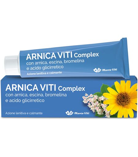 ARNICA VITI Complex - Descrizione Arnica Viti Complex è un coadiuvante cosmetico che sfrutta le proprietà lenitive e protettive dell'arnica associata a escina, bromelina e acido glicirretico. Questi ingredienti sono utilizzati in fitoterapia per dare una sensazione di sollievo in seguito a piccoli … ...