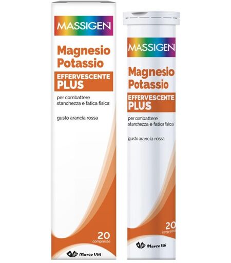 MASSIGEN MAGNESIO e POTASSIOEFFERVESCENTE PLUS DescrizioneIl magnesio può contribuire alla normale funzione muscolare e alla riduzione distanchezza e affaticamento. Il potassio può aiutare a regolare il normalefunzionamento del sistema nervoso e a evitare sbalzi di pressione del sangue.Indicato in tutti gli stati carenziali di magnesio e potassio dovuti a scarso apporto conla dieta, attività fisica intensa, aumentato fabbisogno.Gusto arancia rossa.IngredientiAcido citrico, bicarbonato di potassio; correttore di acidità: sodio bicarbonato;saccarosio, magnesio citrato, ossido di magnesio, aroma; agente antiagglomerante:polietilenglicole; edulcoranti: acesulfame K, sucralosio; agente antiagglomerante:biossido di silicio; colorante: riboflavina.Caratteristiche nutrizionaliValorimediper 100 gper 1 compressa(dosegiornaliera)%VNR% Magnesio112,5 mg30%Potassio6,98 g300 mg %VNR: Valori Nutritivi di RiferimentoModalità d'uso1 compressa effervescente al giorno da sciogliere in un bicchiere d’acqua (150ml.)AvvertenzeTenere lontano dalla portata dei bambini al di sotto dei tre anni di età. Nonsuperare la dose giornaliera consigliata. Gli integratori non vanno intesi come sostitutidi una dieta variata, equilibrata e di un sano stile di vita.ConservazioneConservare a temperatura ambiente non superiore a 25 °C in contenitore chiuso alriparo dall’umidità e da fonti di calore. Evitare l’esposizione afonti di calore localizzato, o raggi solari e il contatto con l’acqua.La data di scadenza si riferisce al prodotto in confezione integra, correttamenteconservato.Validità a confezionamento integro: 24 mesi.FormatoConfezione da 20 compresse effervescenti da 4,3 gPeso netto 86 gCod. VVMI092 ...