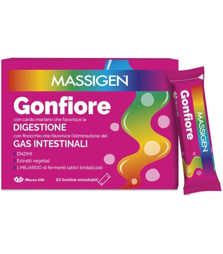 Gonfiore Massigen - Integratore AlimentareIntegratore alimentare con formulazione specifica a base di enzimi, fermenti lattici tindalizzati ed estratti vegetali.Gli enzimi digestivi sono molecole proteiche presenti in tutti gli organismi viventi, compreso l'organismo umano. Svolgono un ruolo fondamentale nella digestione degli alimenti, perché accelerano e catalizzano le reazioni chimiche.Senza glutine, senza lattosio.BeneficiL’estratto di cardo mariano favorisce la digestione, mentre l’estratto di finocchio favorisce l’eliminazione dei gas intestinali.Uso1 bustina dopo i pasti principali per un massimo di 3 bustine al giorno, versare il contenuto di una bustina direttamente in bocca.AvvertenzeNon eccedere le dosi raccomandate per l’assunzione giornaliera. Se si stanno assumendo farmaci, è opportuno sentire il parere delmedico. Tenere fuori dalla portata dei bambini al di sotto dei 3 anni di età. Gli integratori non vanno intesi come sostituti di una dieta variata, equilibrata e di un sano stile di vita. Contiene polioli: un consumo eccessivo può avere effetti lassativi. Conservare in luogo fresco, asciutto al riparo dal calore. La data di scadenza indicata si riferisce al prodotto in confezione integra correttamente conservata.IngredientiEDULCORANTE: ISOMALTO; FINOCCHIO (Foeniculum vulgare Mill.) FRUTTO ESTRATTO SECCO TITOLATO IN OLIO ESSENZIALE; CARDO MARIANO (Silybum marianum (L.) Gaertn.) FRUTTO ESTRATTO SECCO TITOLATO IN SILIMARINA; KIWI (Actinidia deliciosa (A. Chev.) C.F.Liang & A.R.Ferguson) FRUTTO ESTRATTO SECCO; COMPLESSO ENZIMATICO DA SUBSTRATI VEGETALI FERMENTATI: ALFA-AMILASI, PROTEASI NEUTRA, CELLULASI, LACTASI, LIPASI; FERMENTO LATTICO TINDALIZZATO: LACTOBACILLUS PARACASEI MCC1849; CORRETTORE DI ACIDITÀ: ACIDO CITRICO; ANTIAGGLOMERANTE: BIOSSIDO DI SILICIO; EDULCORANTE: SUCRALOSIO.Formato20 bustine orosolubili monodose da 1 g - Contenuto netto totale 20 g. ...