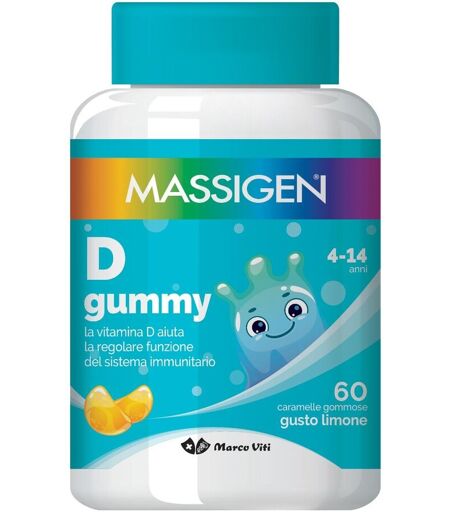 MASSIGEN D gummy Descrizione Integratore alimentare per bambini dai 4 ai 14 anni, con vitamina D. La vitamina D aiuta il regolare funzionamento del sistema immunitario, contribuisce al mantenimento della funzione muscolare, nonche' al mantenimento di ossa e denti sani. è indicato nei casi di ridotto apporto con la dieta o di aumentato fabbisogno fisiologico. Ingredienti Sciroppo di glucosio, zucchero, acqua, gelatina alimentare, acido L-ascorbico (vitamina C), acido citrico, concentrati di frutta e vegetali (cartamo, limone), aroma, colecalciferolo (vitamina D). Senza glutine e lattosio. Caratteristiche nutrizionali Valori medi per 1 caramella per 2 caramelle %VNR* Vitamina D 3 mcg 6 mcg 120% *VNR: Valori Nutritivi di Riferimento Modalità d'uso 1 caramella dai 4 ai 10 anni. 2 caramelle dai 10 anni in su. Avvertenze Tenere fuori dalla portata dei bambini al di sotto dei tre anni di età. Non superare la dose giornaliera consigliata. Gli integratori non vanno intesi come sostituti di una dieta variata, equilibrata e di un sano stile di vita. Conservazione Conservare in luogo fresco ed asciutto. Evitare l'esposizione a fonti di calore localizzato, ai raggi solari e il contatto con l'acqua. La data di scadenza indicata si riferisce al prodotto in confezione integra, correttamente conservata. Formato 60 caramelle. Cod. VVGU004 ...