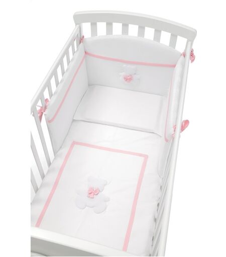 Completo sfilabile ricamato composto da: federina, paracolpi, trapunta con imbottitura estraibile. Tutta la produzione tessile di Erbesi viene effettuata rigorosamente in Italia utilizzando le migliori materie prime. Le dimensioni possono variare a seconda della collezione, ma il piumone misura 150 x 200, federa 40 x 30, paracolpi 62+64+62 x 42 cm. Consigli per il lavaggio: sfilare l'imbottitura dal sacco piumone per il lavaggio in lavatrice a basse temperature; paracolpi: lavaggio a mano a basse temperature; federa: lavaggio in lavatrice a basse temperature. ...