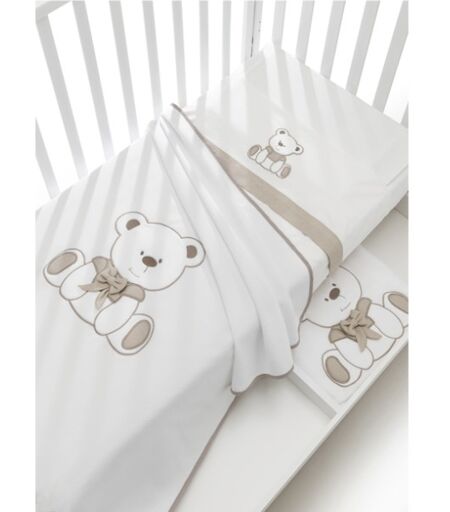 Completo 3pz Erbesi Tato Il completo 3 pezzi Erbesi tato, adatto per le stagioni piu calde, completa la linea Tato. Caratterizzato da un simpatico orsetto con rifiniture nella variante rosa, azzurro, grigio e tortora e completo di: lenzuolo di sopra, lenzuolo di sotto e federa per cuscino. ...