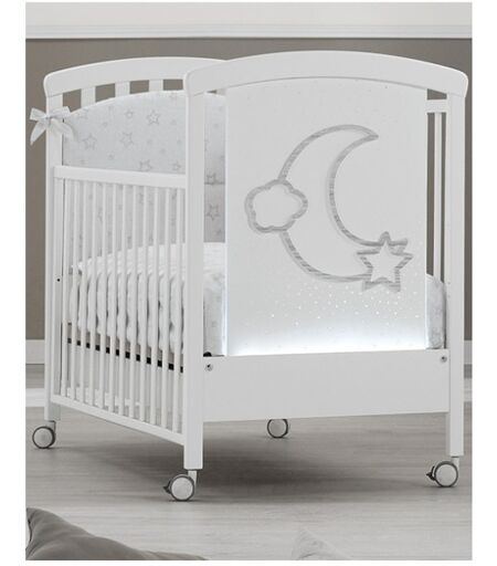 LETTINO ERBESI MOONIl lettino della collezione Moon di Erbesi ha una struttura in legno di faggio. È compreso di un ampio cassetto e 4 ruote piroettanti con gomma antitraccia (di cui 2 con freno). Entrambe le sponde sono mobili, ed il kit doppia altezza e incluso. La particolarita di questo lettino e il pannello in plexiglass serigrafato e pantografato con un decoro a forma di luna e impreziosito dallutilizzo di una striscia di LED colorati alla base che ne illumina i margini, sfruttando la cromo terapia per creare un mondo rilassante per i piccoli. Conforme alla normativa europea EN 716-1: 2008 A1: 2013. ...