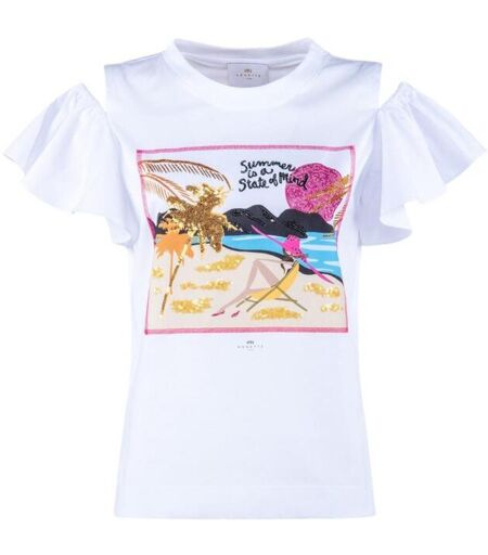 T-shirt off shoulderManiche con volantInserto in seta con stampa tramonto in strass e paillettesComposizione: 100% Cotone ...