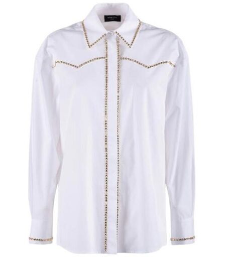 Camicia dal taglio moderno, maniche lunghe e dettagli di borchie lungo il colletto, l'abbottonatura centrale e la parte superiore del busto. Annodata in vita e perfetta per un look casual-chic.-100% COTONE ...