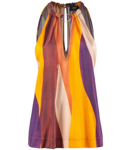 Top con stampa geometrica ad onde multicolore nei toni caldi e vivaci. Lo scollo all'americana e il dettaglio dell'anello creano un'arricciatura elegante. Dal design sofisticato e versatile, perfetto per aggiungere un tocco glamour al proprio outfit.100% VISCOSA ...