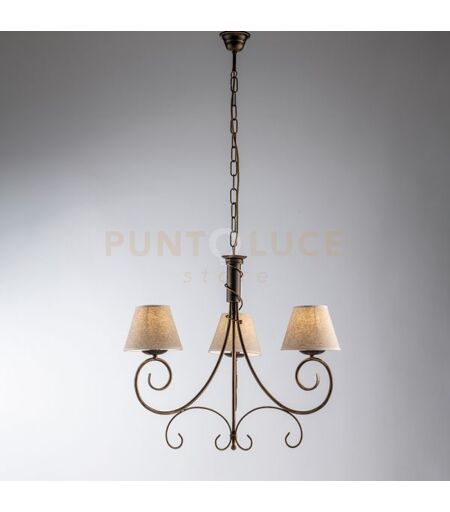 Lampadario In Ferro Laccato Marrone Con Decorazione Oro Antico E Paralumi Diametro 13 In Pvc Effetto Tessuto Juta 3 Luci ...